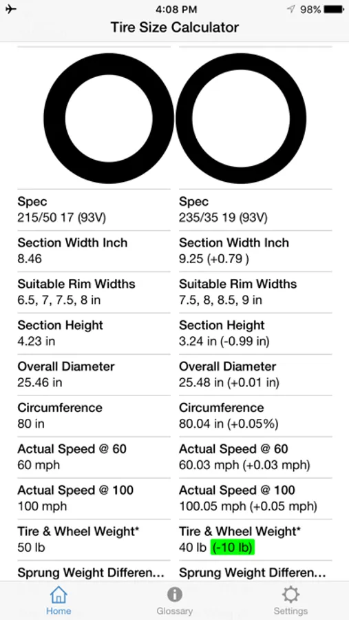 What makes this app standing out from the crowd: calculate approximate equivalent sprung (chassis) weight difference after changing to a new set of tire+wheel.