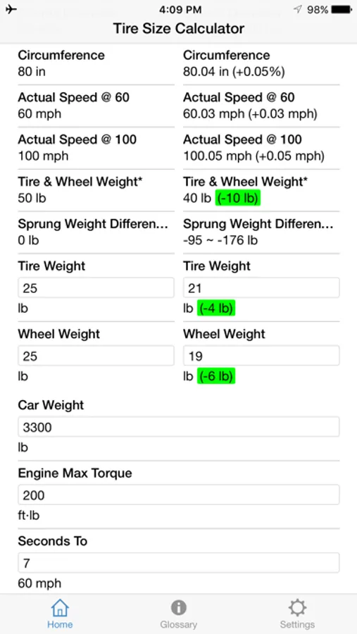 3. Calculate approximate equivalent car chassis (sprung) weight differences after change to the replacement/upgrade tire+wheel, using the following data: car weight, engine max torque, car 0-60 mph/0-96.6 km/h time, tire/wheel sizes/weights, in either Imperial or Metric units.