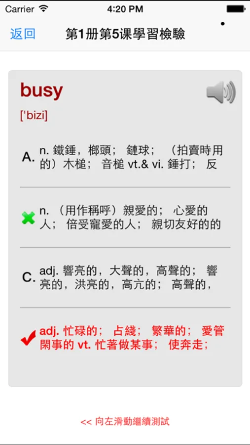最新加入单元测试模块,助您检验学习成果。本软件提供新概念英语课本所有课程的单词列表,所有单词配有详细解释及发音。