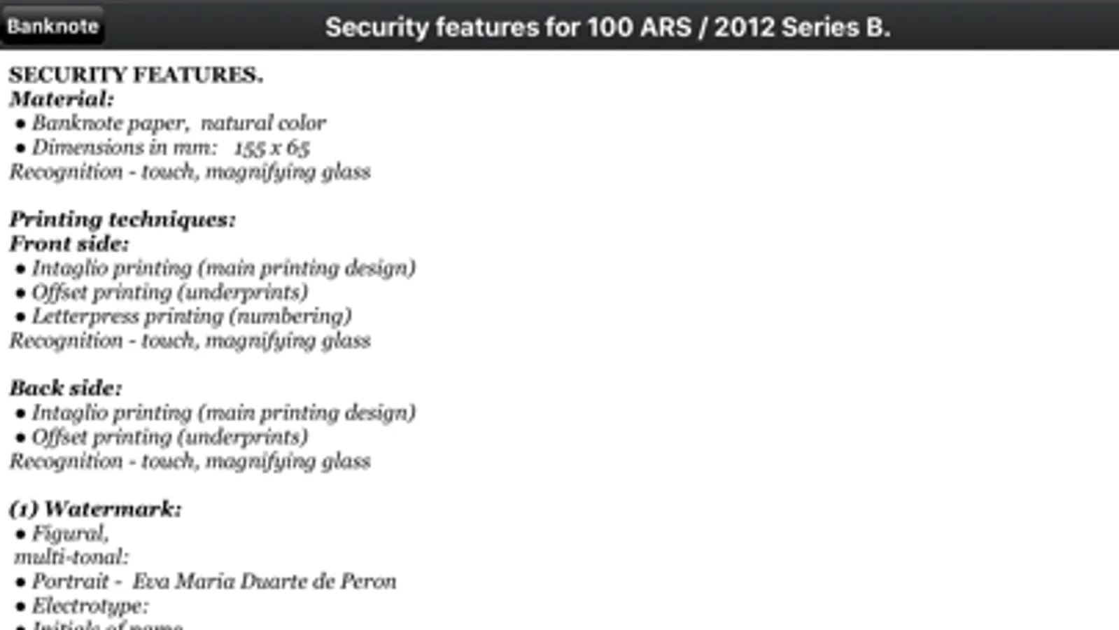 MoneyCheck+ contains banknotes cecurity information of all valid banknotes of the world. Therefore, this application contains 185 currencies of the world, 3 000 illustrations, 25 000 security features, and description of ways of its authentication.