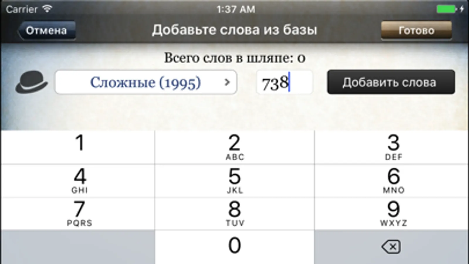 Используйте свои слова и/или добавляйте сколько угодно из более чем 12000 готовых слов различной сложности.