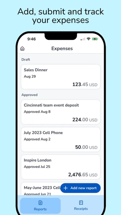 • Capture expenses easily with receipt photos and quick OCR, or manual entry