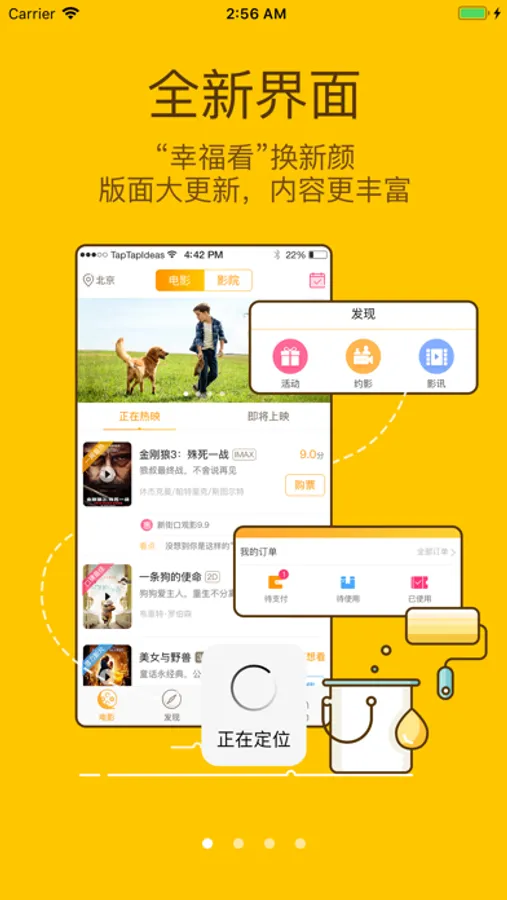 1. GPS定位附近影城,随时查看影城排片,在线选座轻松购票购卖品,精彩快人一步;