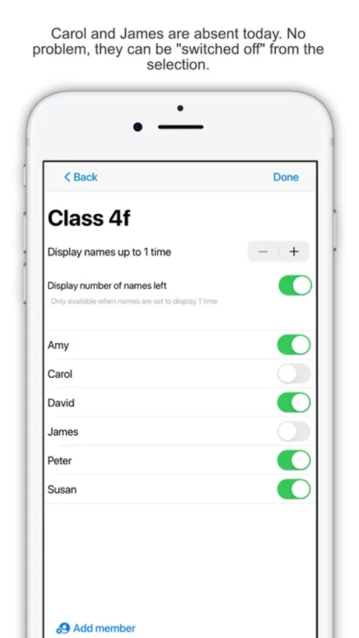 • If you want to exclude a Student/s from the selection, simply turn them off in the settings screen. This can be particularly useful for any absentees.