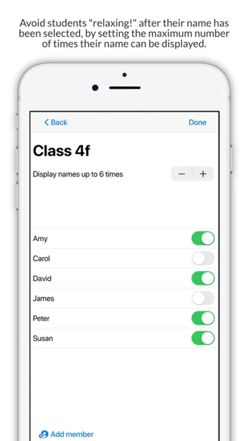 • The teacher can determine how many times any single name can be displayed. This avoids the problem of students “switching off” once their name has been selected once.