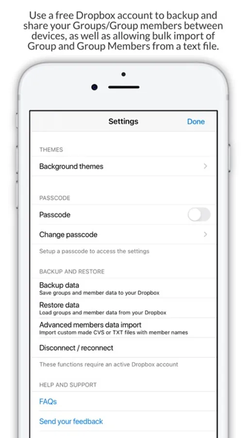 • Use a FREE Dropbox account to backup and “Sync” your Groups/Group members with your other devices. You can even use the same Groups/Group members in our “Random Team Selector Pro” app (separate purchase).