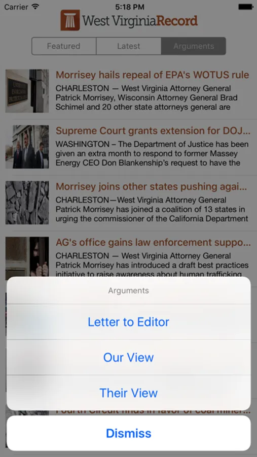 The app allows you to view Stories (Featured, Latest News, Most Popular), Arguments (Our View, Their View), Courts (Federal, State Supreme), and Issues.