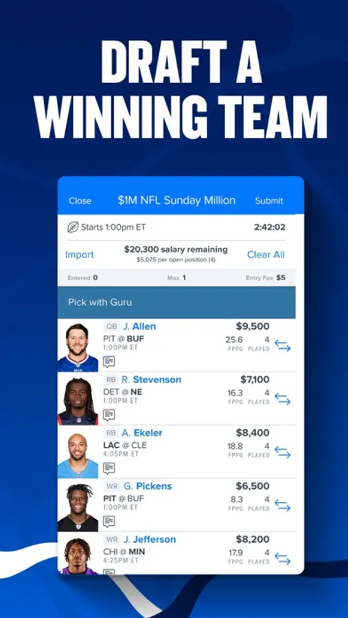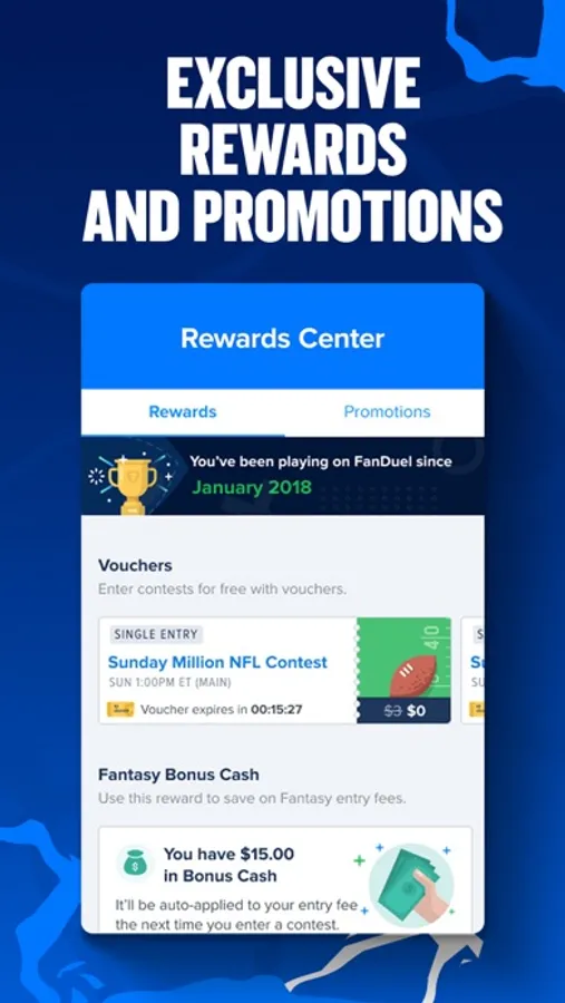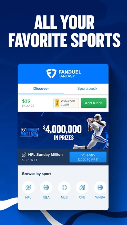 FanDuel Fantasy Sports lets you make every moment more all season long! Draft your favorite players into your lineup for a chance to win real money prizes all season long! FanDuel gets you in on the daily and nightly action for NFL, MLB, NCAAF, NBA, PGA, NHL, UFC, Soccer, and more! Want to create your own fantasy league? Build your custom contest on FanDuel, invite your friends, and play for real cash! Make sure to check out FanDuel for our latest promotions and bonuses for both new and returning fantasy players!