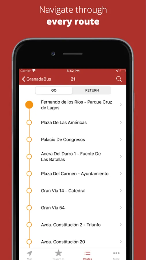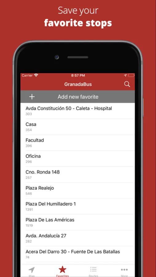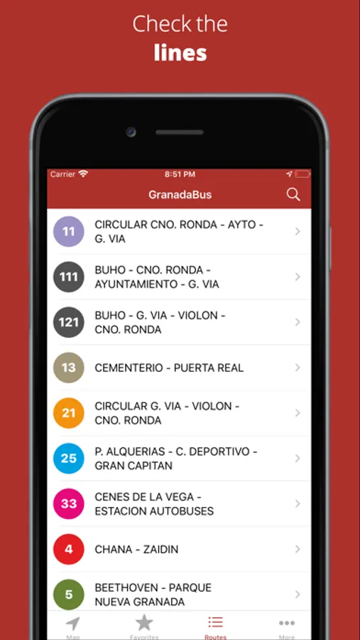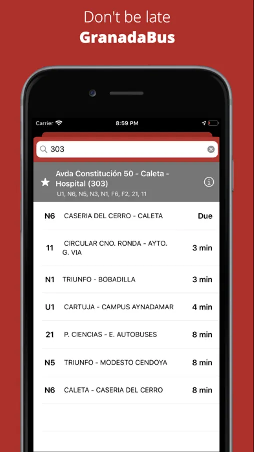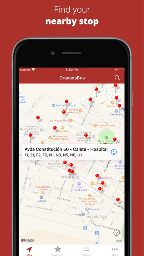 GranadaBus allow you to check how long takes the bus to arrive to the bus stop, to know where is the nearest bus stop to your location and more.