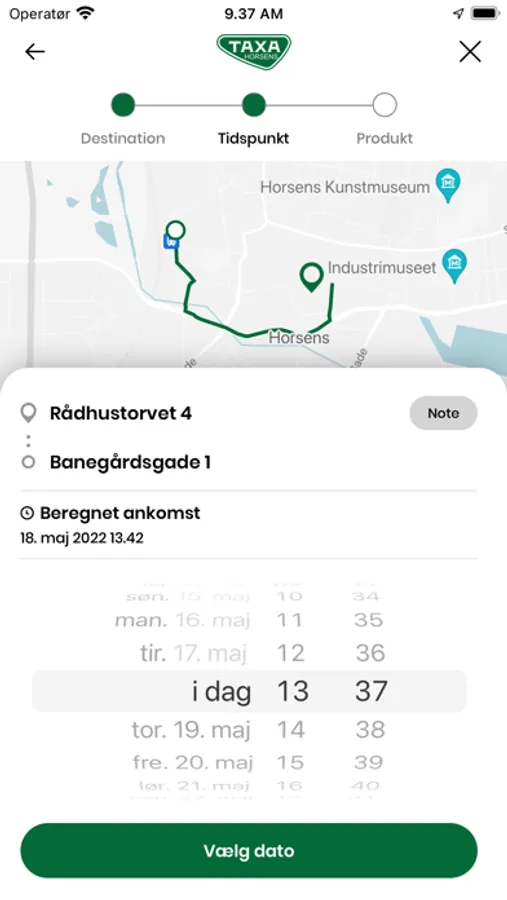 Når du åbner appen, finder den din nærmeste adresse. Flyt kortet eller indtast din afhentningsadresse for at blive hentet et andet sted end der, hvor du er lige nu. Kræver din afhentningsadresse lidt ekstra forklaring? Så indtaster du bare en besked til chaufføren.