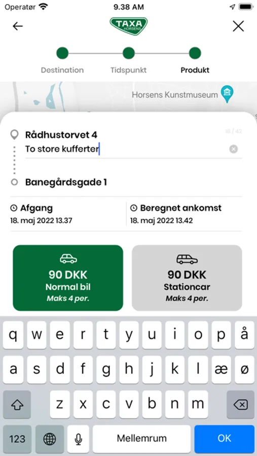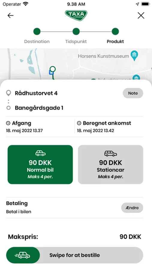 Når du indtaster både din afhentnings- og leveringsadresse, så giver vi dig en maksimumspris som taxameteret ikke overstiger. På denne måde får du sikkerhed for prisen.