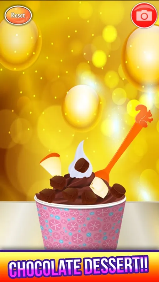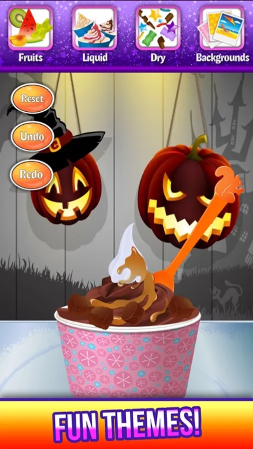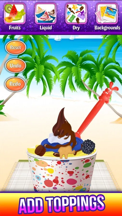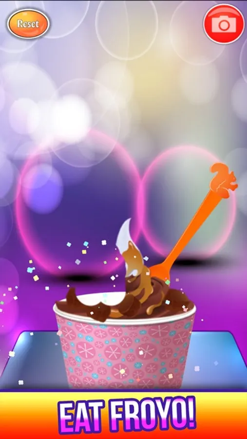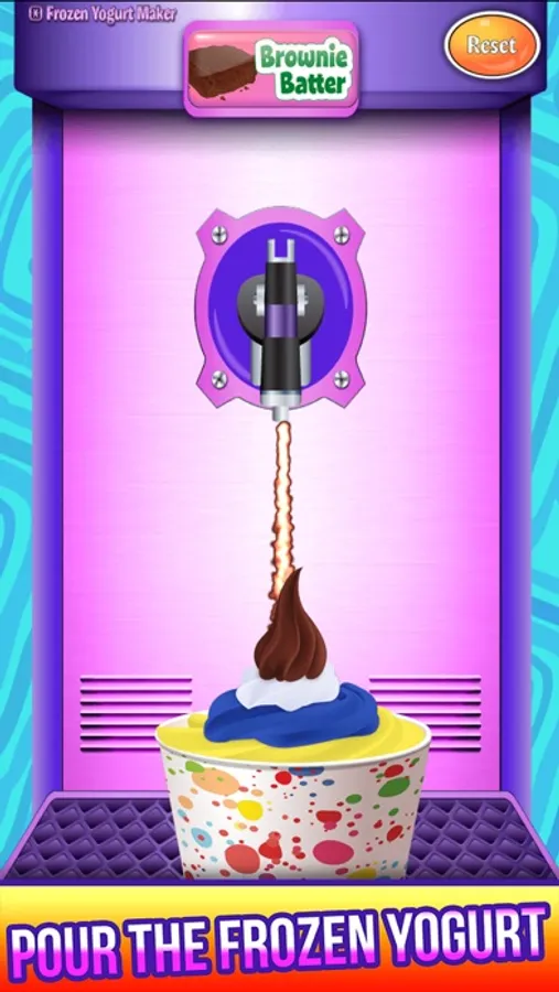 Choose your cup, then pour the frozen yogurt from the machine into the cup! Add a spoon, decorate your treat, add toppings, change backgrounds and much more! Eat your frozen treat!