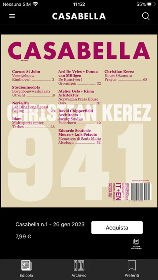 • Se hai un abbonamento attivo alla versione cartacea di Casabella, potrai leggere la versione digitale su questa App! Effettua il login (da Menu – Account – Login) e porta sempre con te la tua rivista preferita.