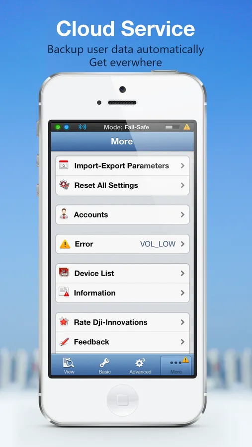 The "WM" Assistant Software is aimed at assisting the parameters configuration of WooKong-M. In addition to the accurate real-time flight data display, there is also another new feature - "Remote Parameter Adjustment". You only need an IOS equipment that supports Bluetooth 4.0 (such as: iPhone4s, iPhone5, iPod touch5). During the flight, you can adjust the gain value of the aircraft any time to make it more stable. At the same time, it supports data import and export and will backup in to the Clouds Server. It gives a seamless switching and will automatically save your data.
