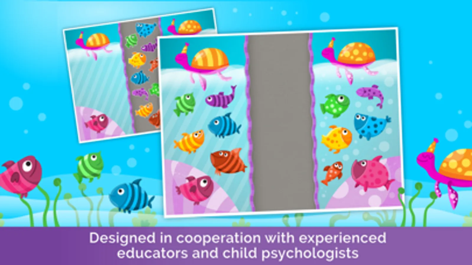This game is intended for toddlers aged 3+. The game presents 12 boards each focused on developing a set of basic concepts such as size, colors, numbers and patterns using everyday objects from the child's world such as clothes, food and many more.
