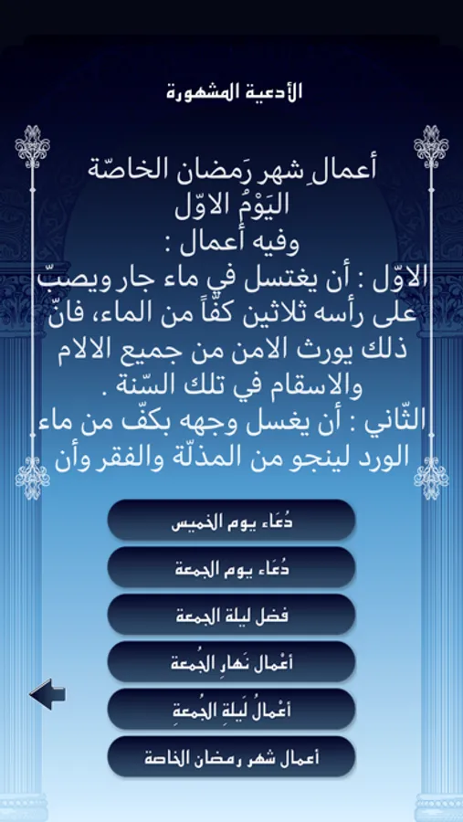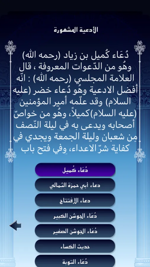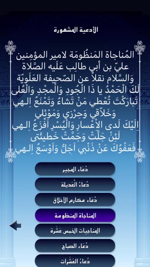 هذا التطبيق يحتوي على كافة الأدعية المأثورة والمأخوذة من القرأن الكريم, كتب نهج البلاغة مفاتيح الجنان وإكسير الدعوات. وهو مقسم إلى أربعة أجزاء: