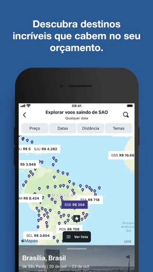 • Sugestões de destinos baseadas no seu orçamento ou na data que você quer viajar.