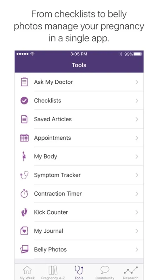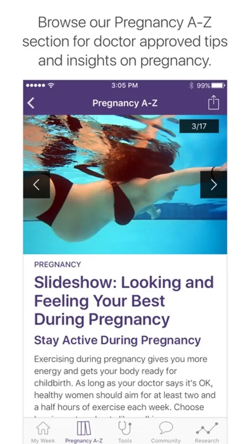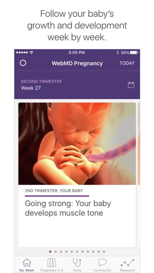 Our free pregnancy app offers trusted health information for expecting parents and lets you track your baby’s growth and development week by week. Get access to more than 900 doctor-approved articles, videos, slideshows and quizzes, safety tips, and expert-curated checklists. Find support and maternity advice in our caring Pregnancy Community. Track your baby's and your health with our symptom tracker, weight and blood pressure tracker, kick counter, and contraction timer. Fun features such as the journal and the belly photo album will help you prepare for your pregnancy and fully embrace the experience.
