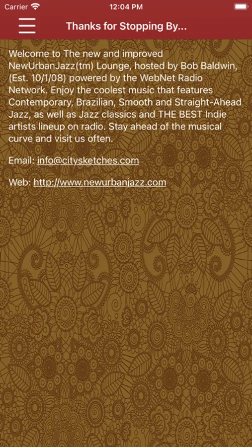 NewUrbanJazz continues to reach new heights, with conversations in the SouthEast and Mid-Atlantic regions, headed by Bob Baldwin's "NewUrbanJazz Lounge", a weekly 2-hour program that features all cornerstones of jazz from all around the world.