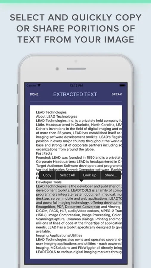 • Text-to-Speech "Speak" option for phone playback of extracted text
