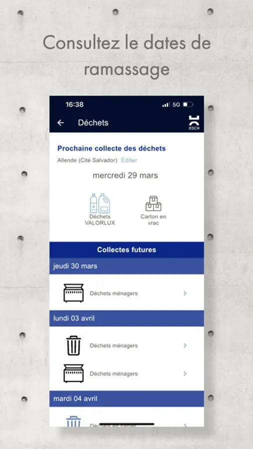 - Accédez aux dates des ramassages des déchets et recevez une notification pour vous rappeler de sortir les poubelles