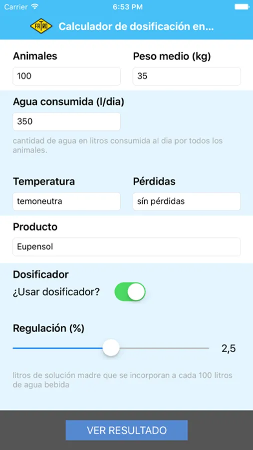 Simulador destinado a uso animal que permite calcular las proporciones y dosificación de agua. Se pueden seleccionar los productos de Fatro.