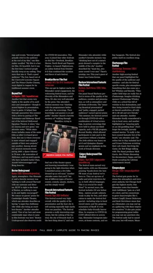 MovieMaker is the nation's leading magazine on the art and business of making movies. Founded in 1993 and available on newsstands across North America and parts of Europe, the publication has a quarterly readership of 150,000. Its companion website, established in 1995, is one of the most popular movie sites on the web. MovieMaker is a special interest consumer publication with content directed at the audience as well as the artist. Its lively mix of in-depth criticism, festival coverage, do it yourself moviemaking techniques and profiles of both rising and legendary Hollywood actors, directors, cinematographers, producers, screenwriters and editors make it a perennial favourite with readers the world over. Although the magazine's core audience is both independent filmmakers and Hollywood's leading players, one needn't be a moviemaker to love MovieMaker, one simply needs to love movies.