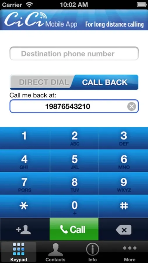 The Direct Dial feature enables you to make long distance calls from your cell phone by simply selecting your destination number and initiating the call; the application dials all the required access and PIN numbers and connects you to your called party. Simply, key in your destination number or select a destination number from your contact list - we will do the rest! The CiCiMobile iPhone App comes with a free trial of long distance minutes to call anywhere in the world. Simply download the free App and enjoy making quality long distance calls using your iPhone at extremely discounted rates! With CiCiMobile you will be able to enjoy the following features -just to name a few: + No monthly service fees or hidden charges + Great long distance competitive rates + Affordable international calling + Simple application to download + Never enter access or PIN numbers again + Avoid expensive roaming charges worldwide with the Enhanced Call Back feature + Take advantage of your unlimited incoming call plans and avoid using your mobile outgoing minutes using the Call Back feature + No need to change your service provider + Multilingual, 24-hour customer service