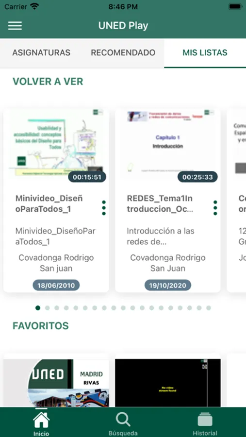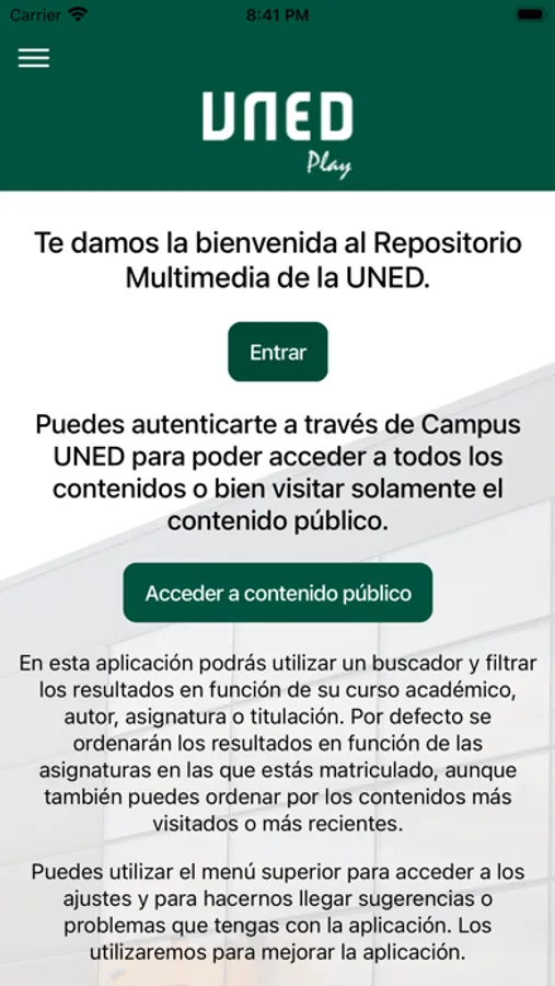 Aplicación oficial de la Universidad Nacional de Educación a Distancia (UNED) para la reproducción de recursos multimedia de los repositorios. Estos recursos audiovisuales son las sesiones publicadas en el Portal AVIP de INTECCA y los videos de Canal UNED, que comprenden eventos, videoclases, tutorías de los Centros Asociados, documentales, etc., que se celebran diariamente en la UNED. Este nuevo buscador te permite encontrar los recursos pertenecientes a las asignaturas en las que estás matriculado y también te facilita el filtrado de resultados a partir de autores, titulaciones y cursos entre otros.