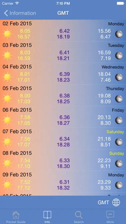 • Sunrise/Sunset, Moon Rise/Set and Twilight Start/Set.