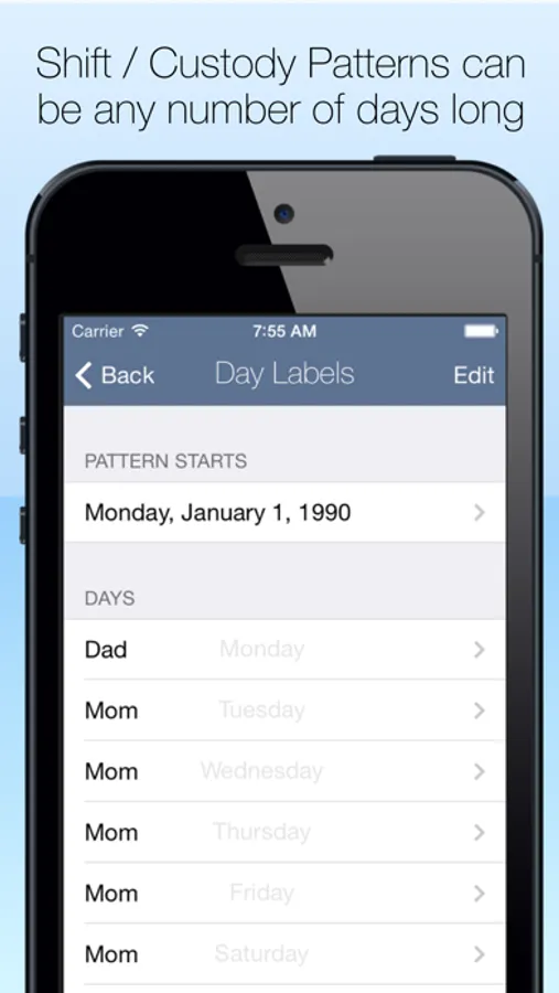 You can store a daily pattern against each Shared Calendar to store your work shifts, child custody days or any other repeating pattern.