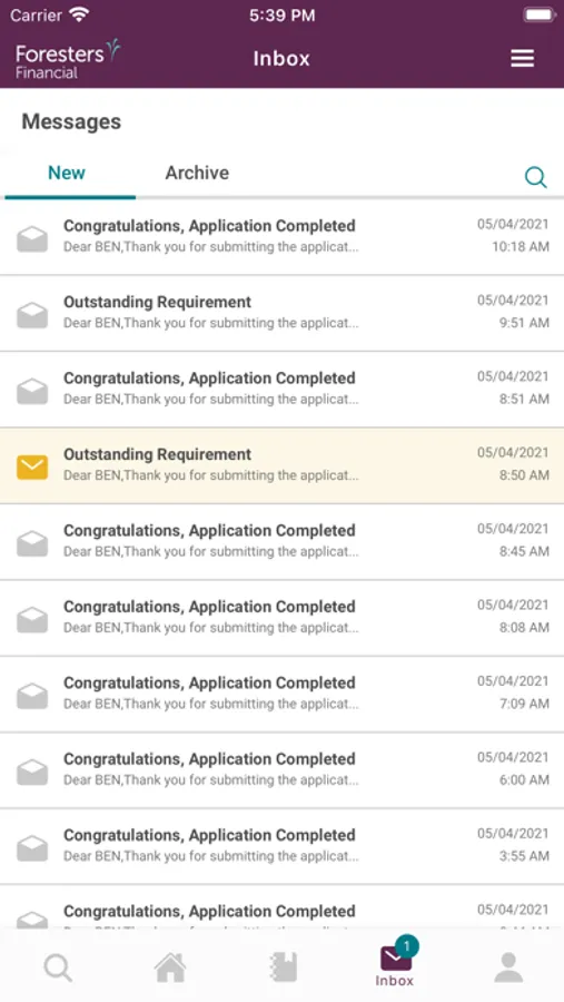 * Inbox to search and view details of recent outstanding requirements and completed applications
