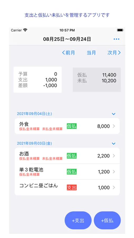 支出や仮払を登録し、①支出、②仮払金、③未払金、の管理ができるアプリです。以下のようなことが出来ます。