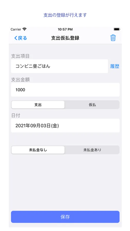 日付、支出項目、支出金額、未払金の登録を行うことができます。