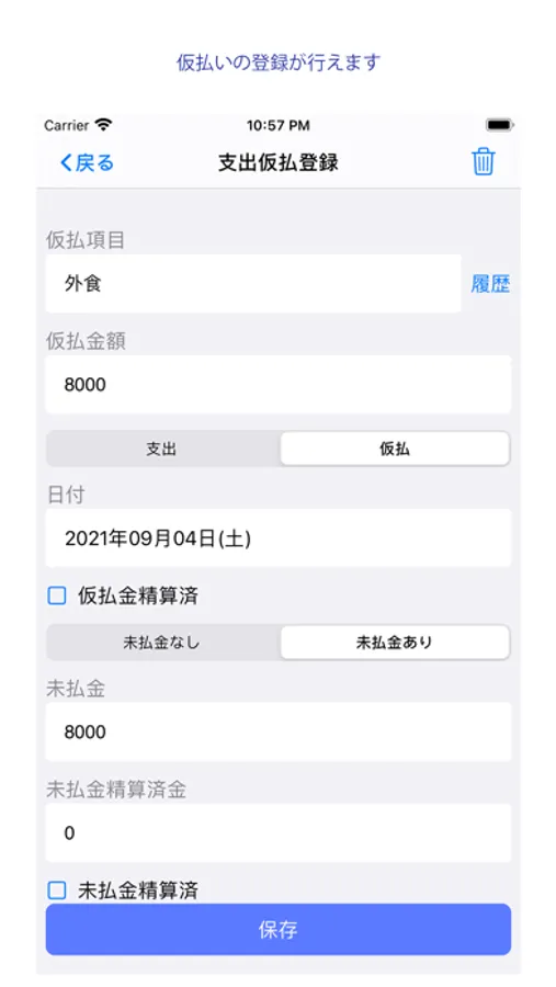 日付、仮払項目、仮払金額、未払金の登録を行うことができます。