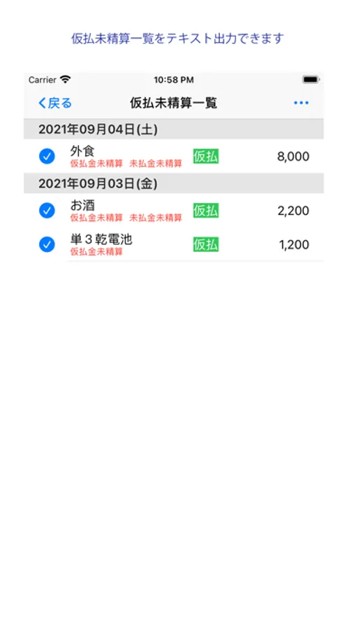 ・支出とは別に仮払を登録し、明細をテキスト出力、潰し込み(会社の経費や家計を別管理したい場合に便利です)