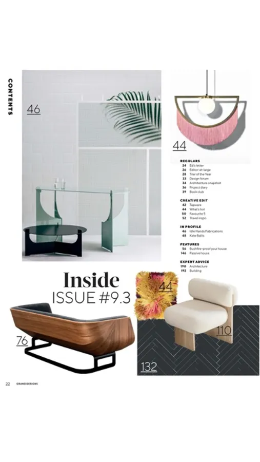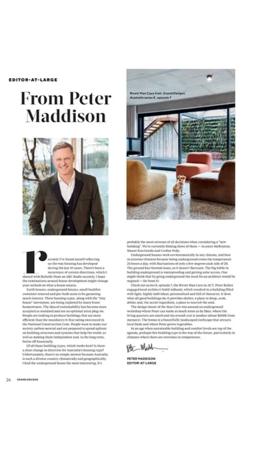 At Grand Designs Australia Magazine we believe in the transformative power of good design. Each issue Editors Peter Maddison and Kate St James scour the countryside to bring you the most stunning designer homes, many of which have not yet been seen on TV, and tell the roller coaster story of how design facilitates lifestyle. Our homes cover a diversity of styles and budgets; some new builds, some conversions, and some renovations. Each issue is a also sourcebook of quality design – complete with floor-plans, look guides, designers, contacts and signature products to inspire a rethink of your own home space.