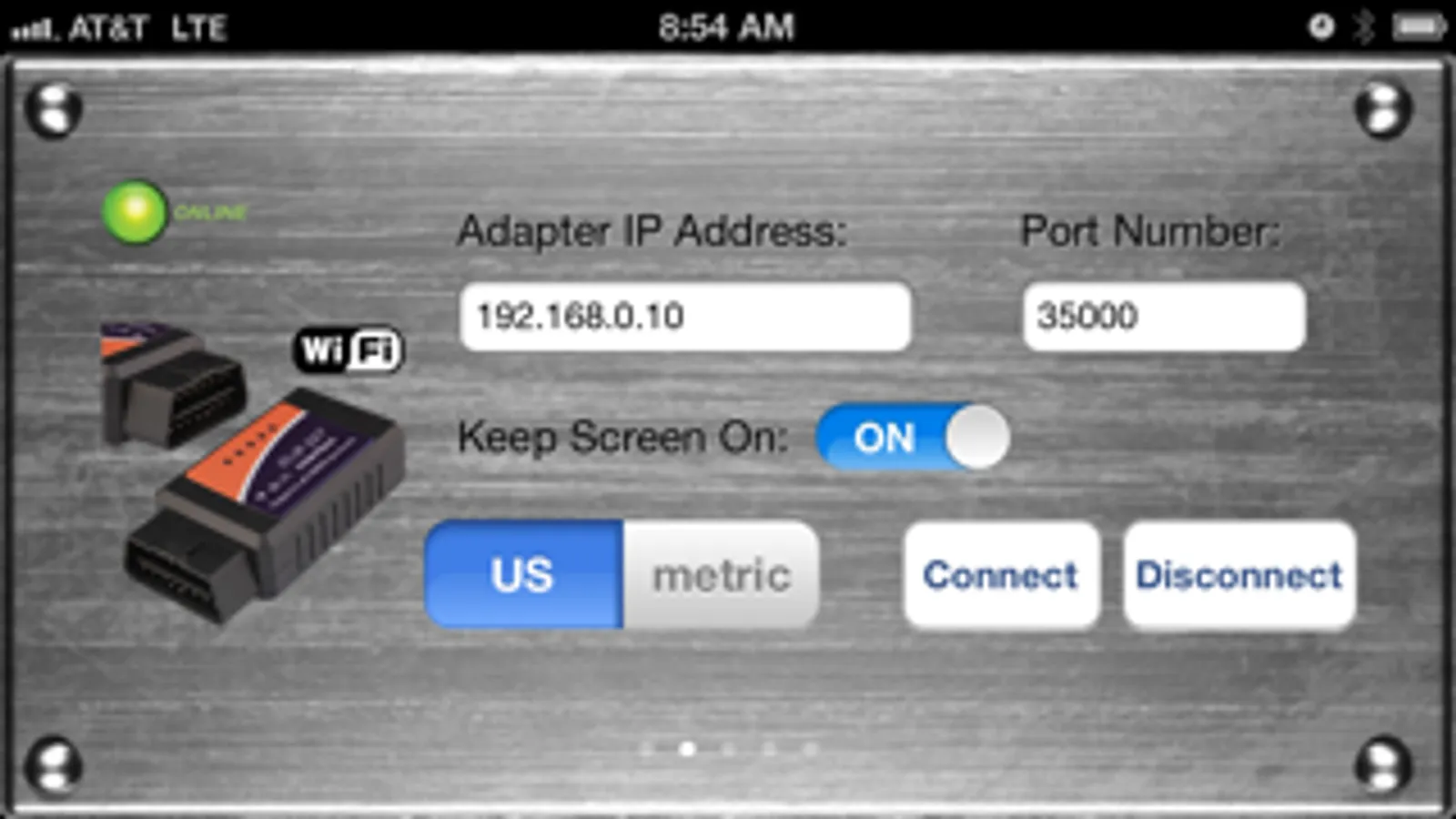 The app needs an ELM compatible Wi-Fi or Bluetooth Low Energy (for iPhone4s and later) adapter to work.