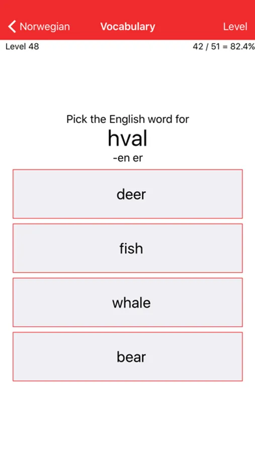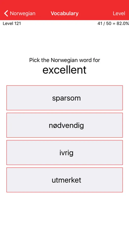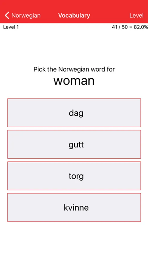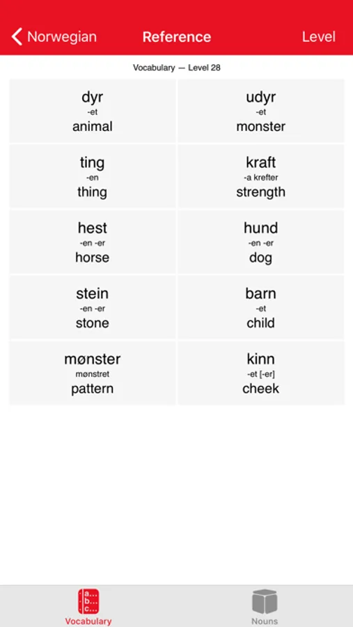 • Vocabulary: Organised into 150 levels, each covering the translation of 10 vocabulary words between Norwegian and English. Some of these groups are arranged thematically, while others are designed to bring to your attention words which are easily confused, or which have false cognates in English, French, or German. Interspersed among these levels are additional cumulative levels reviewing what has been learned earlier, for a total of 170 levels.