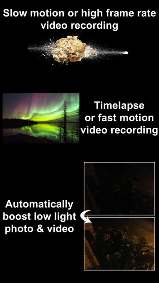 • Automatically boost low light photo & video visibility and quality