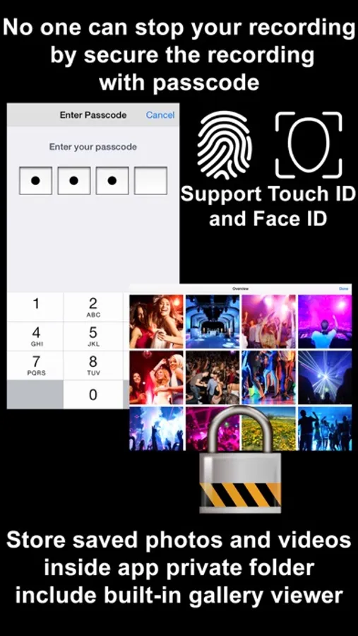 • No one can stop your recording by secure the recording and lock UI buttons with passcode