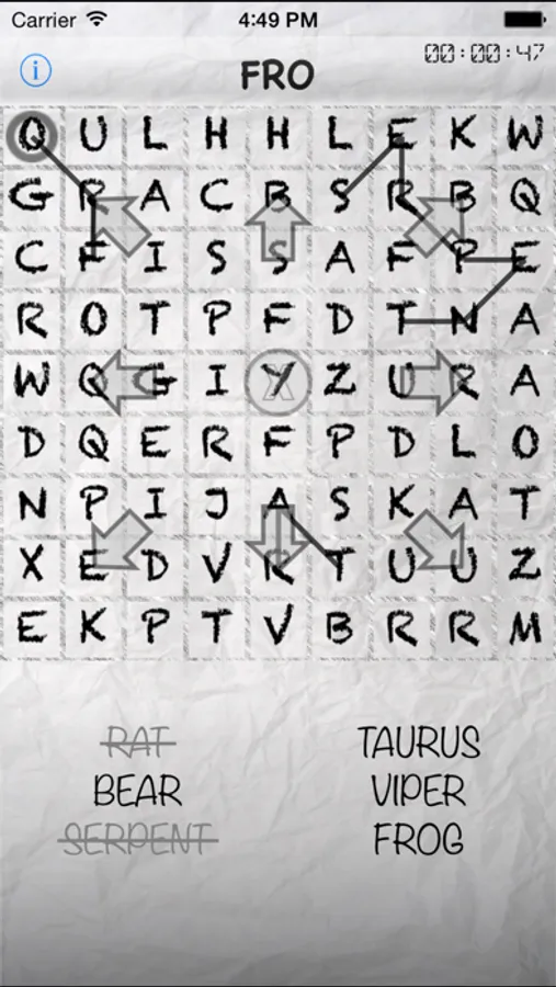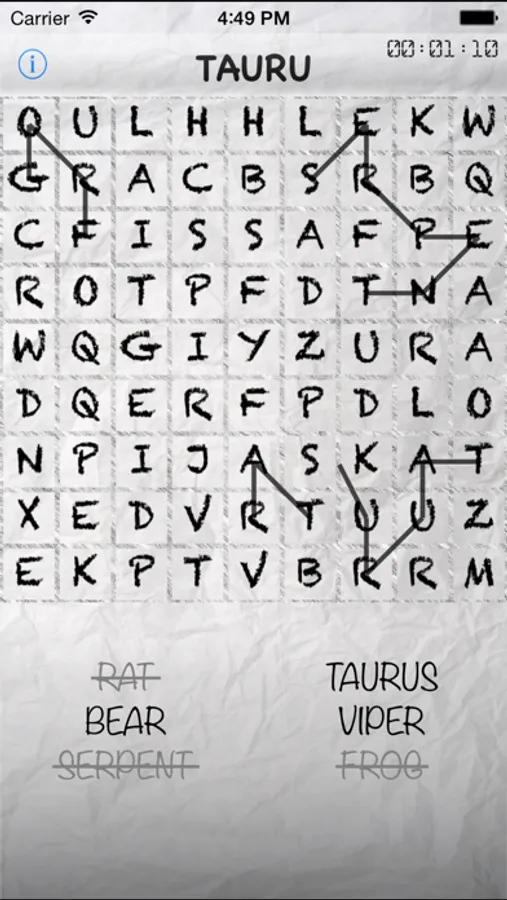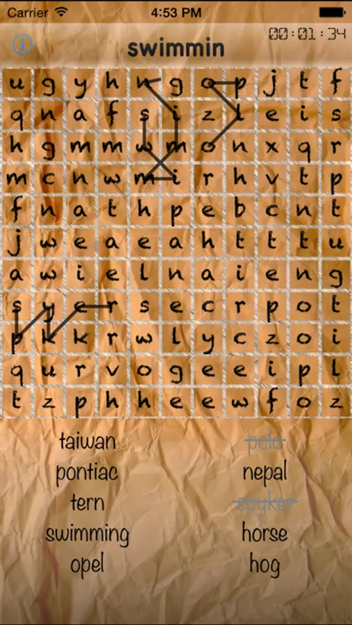 words puzzle game, where you have to find and cross out all given words, that are layout in random curve.