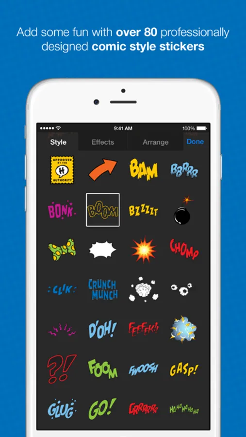 • Optional “Action Pack” in-app purchase adds over 50 more stamps designed by comic design company, Blambot