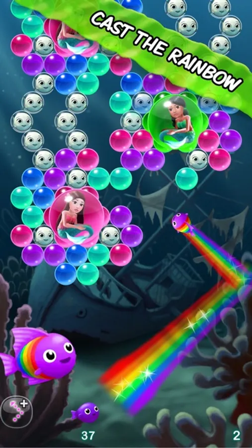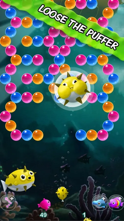 Choose between various types of fish, like rainbow fish or puffer fish, each with different special powers and effects. Pop higher bubbles to drop lower bubbles. Explore an enchanted ocean with amazing graphics, beautiful music, special effects, and the cutest fishes around.