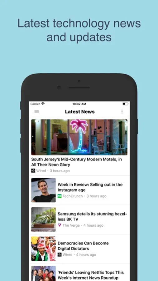 TechPort allows you to keep up to date with technology news and updates from the best news sources online such as The Verge, TechCrunch, Wired, Ars Technica, The Next Web and many more.