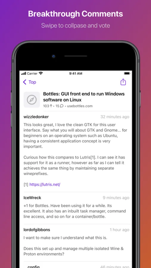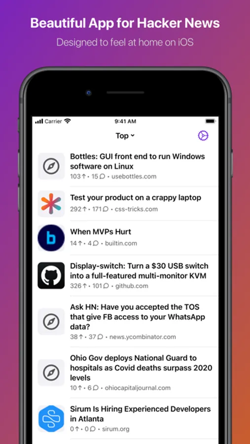 Hackers is the ultimate app for Hacker News. We focus on the reading experience, with a simple yet beautiful UI and clean typography. Navigate large comment threads with ease just by swiping left. Up vote posts and comments by swiping right.