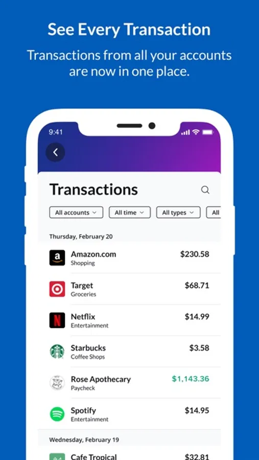 Review transaction details with merchant logos and clear descriptions, to easily identify purchases at a glance.