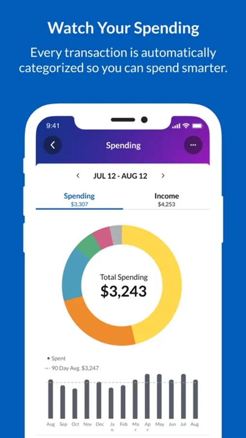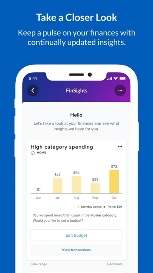 Receive personalized insights (“FinSights”) across all of your connected accounts to stay informed of any unusual activity, visualize your spending trends, predict potential overdrafts, and monitor your bills and subscriptions.