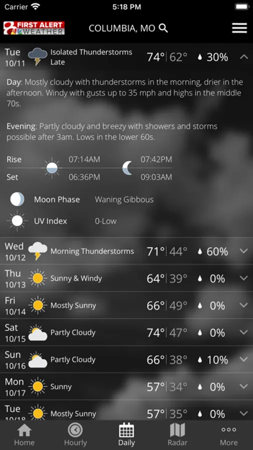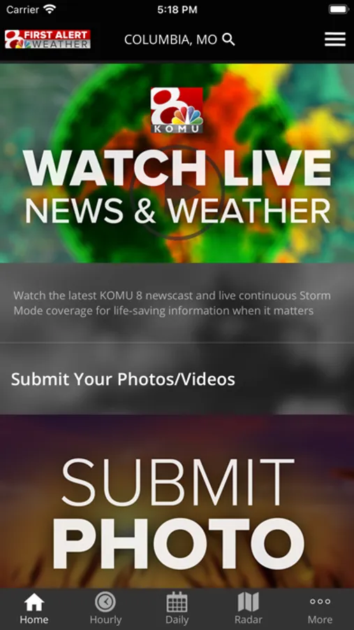 The KOMU 8 First Alert Weather app features hour-by-hour and ten-day forecasts, radar with detailed overlays, such as clouds, precipitation and wind speed, and a breakdown of the latest mid-Missouri conditions from the KOMU 8 First Alert Weather team. Also, share your weather photos with KOMU 8 in the “SUBMIT PHOTO” section.
