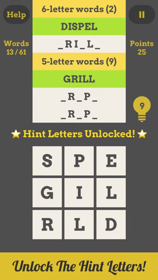 The Hint Letters will help you to complete the grid for a 50 points bonus.